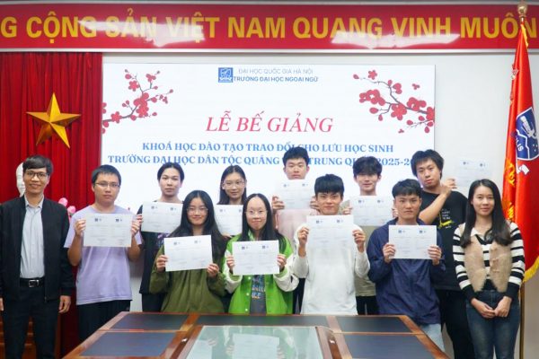 Ngày 15/1/2026, Trường Đại học Ngoại ngữ – Đại học Quốc gia Hà Nội đã tổ chức Lễ Bế giảng khóa học đào tạo trao đổi cho lưu học sinh Trường Đại học Dân Tộc Quảng Tây, Trung Quốc năm 2025. Tham dự buổi lễ