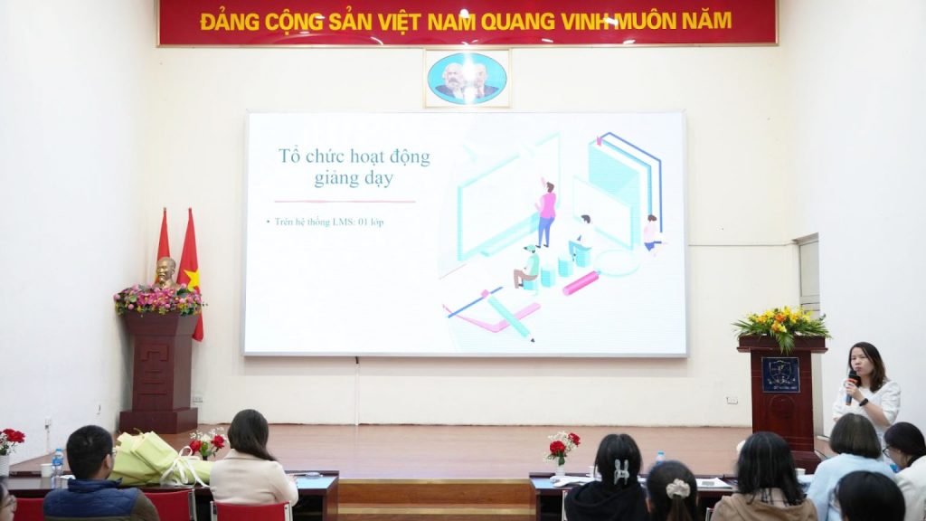 Tiếp nối chương trình, Chuyên viên Phòng QTNL Nguyễn Đức Hoàng đã thiệu về hệ thống E-learning trên hệ thống LMS nhằm giúp các học viên tiếp cận với các học phần trực tuyến của chương trình học.