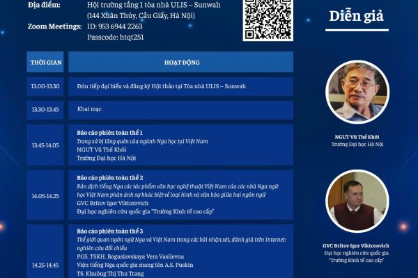 🎓 Hội thảo Khoa học Quốc tế: “Dạy – học và nghiên cứu ngôn ngữ, văn hóa Nga tại Việt Nam” 📅 Thời gian: 13h00 – 17h45, Thứ Bảy, ngày 01/11/2025📍 Địa điểm: Hội trường ULIS – Sunwah, Trường Đại học Ngoại ngữ – ĐHQGHN🌐