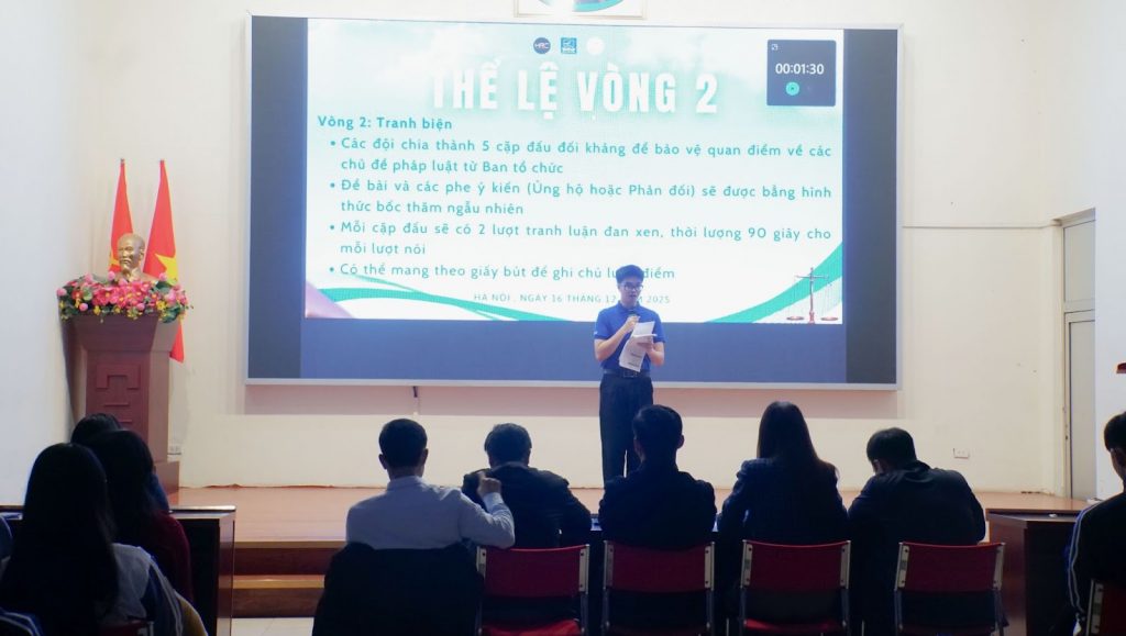Ở vòng thi thứ hai – Tranh biện, các đội thi bước vào những màn đối kháng đầy kịch tính và hấp dẫn. Theo đó, 10 đội được chia thành 05 cặp đấu, cùng tranh luận và bảo vệ quan điểm trước các chủ đề pháp luật do Ban Tổ chức đưa ra. Đề bài và phe ý kiến (Đồng ý hoặc Không đồng ý) được quyết định hoàn toàn ngẫu nhiên thông qua hình thức bốc thăm. Mỗi cặp đấu trải qua 02 lượt tranh luận đan xen, với thời lượng tối đa 90 giây cho mỗi lượt phát biểu, đòi hỏi các đội không chỉ có kiến thức pháp luật vững vàng mà còn phải thể hiện tư duy phản biện sắc bén, khả năng lập luận logic và kỹ năng trình bày thuyết phục.
