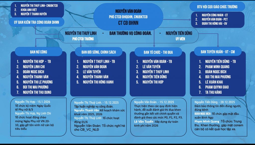 CÔNG ĐOÀN TRƯỜNG ĐẠI HỌC NGOẠI NGỮ - ĐHQGHN Cơ cấu tổ chức Home / Chuyên trang Công đoàn / Cơ cấu tổ chức Liên kết nhanh Chuyên trang CÔNG ĐOÀN Giới thiệu Cơ cấu tổ chức Văn bản Biểu mẫu công đoàn TRƯỜNG ĐẠI HỌC NGOẠI NGỮ - ĐHQGHN CƠ CẤU TỔ CHỨC CÔNG ĐOÀN