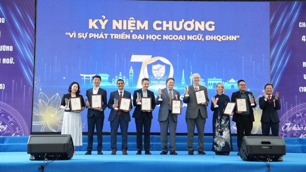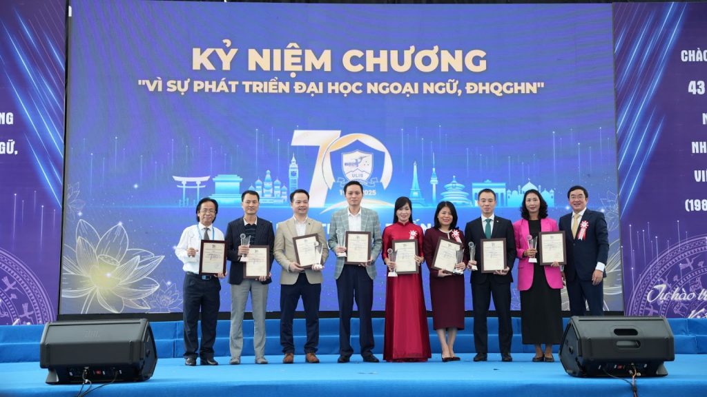 Tiếp nối chương trình, Trường Đại học Ngoại ngữ đã trao kỷ niệm chương, vinh danh các cá nhân, đơn vị đồng hành và cựu người học trong khuôn khổ Lễ kỷ niệm 70 năm thành lập Nhà trường. Hoạt động này nhằm ghi nhận những đóng góp, đồng hành và cống hiến của các thế hệ, đơn vị đối với sự phát triển của Trường.