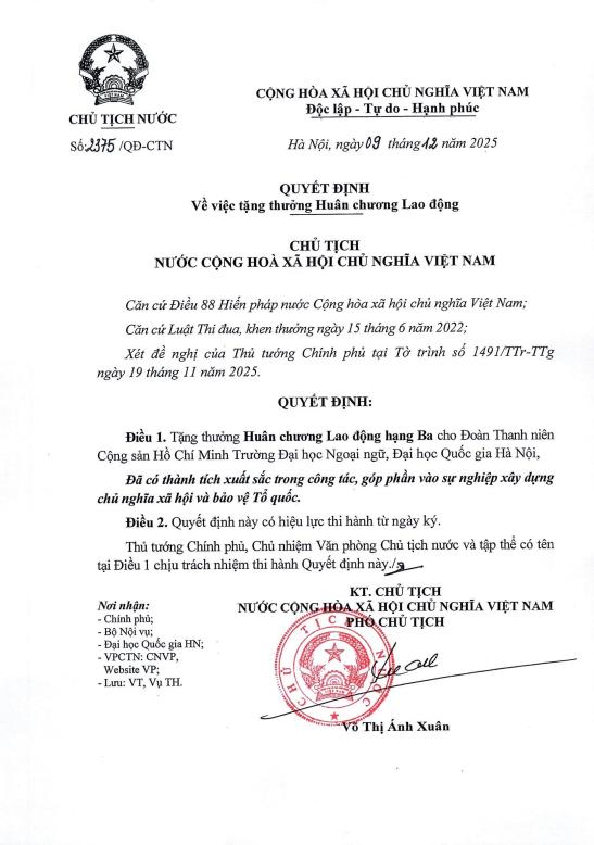 Đoàn TNCS Hồ Chí Minh Trường Đại học Ngoại ngữ, ĐHQGHN vinh dự được Chủ tịch nước Cộng hòa Xã hội Chủ nghĩa Việt Nam tặng thưởng Huân chương Lao động Hạng Ba vì đã có thành tích xuất sắc trong công tác; góp phần vào sự nghiệp xây dựng chủ nghĩa xã hội và bảo vệ Tổ quốc theo Quyết định số 2375/QĐ-CTN ngày 09 tháng 12 năm 2025.