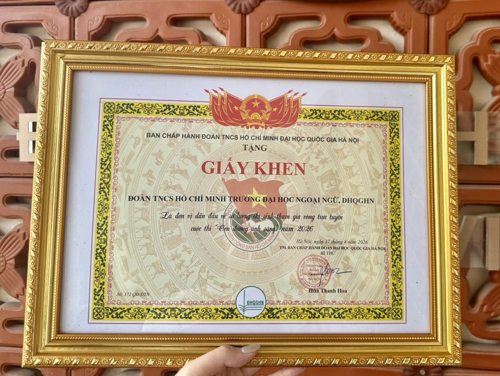 Cũng trong khuôn khổ cuộc thi, Đoàn TNCS Hồ Chí Minh Trường Đại học Ngoại ngữ cũng vinh dự nhận Giấy khen “Là đơn vị dẫn đầu về số lượng thí sinh tham gia vòng trực tuyến cuộc thi “Con đường ánh sáng” năm 2026”. Thành tích này là minh chứng rõ nét cho tinh thần chủ động, tích cực và sự hưởng ứng nhiệt tình của tuổi trẻ Trường Đại học Ngoại ngữ.