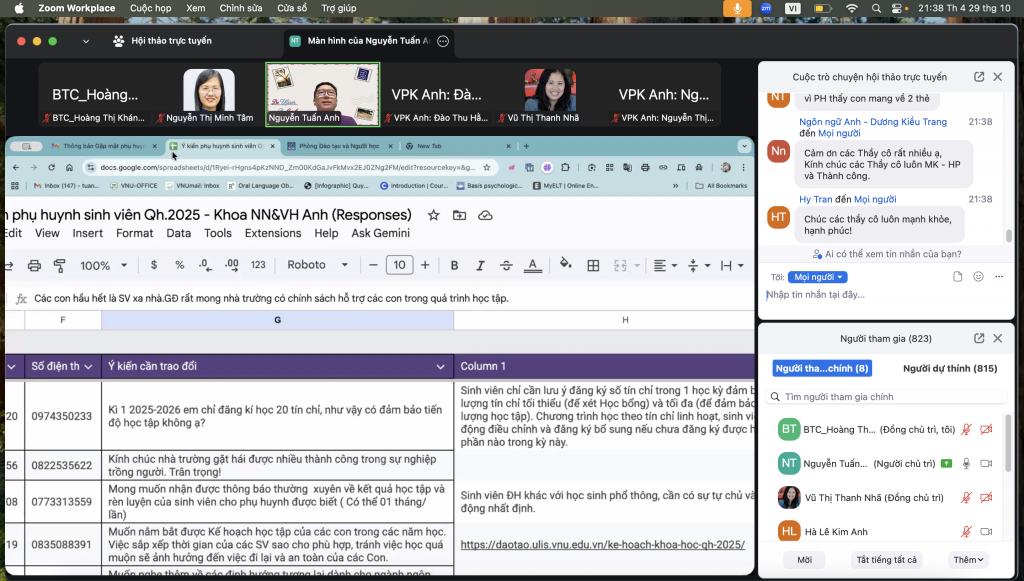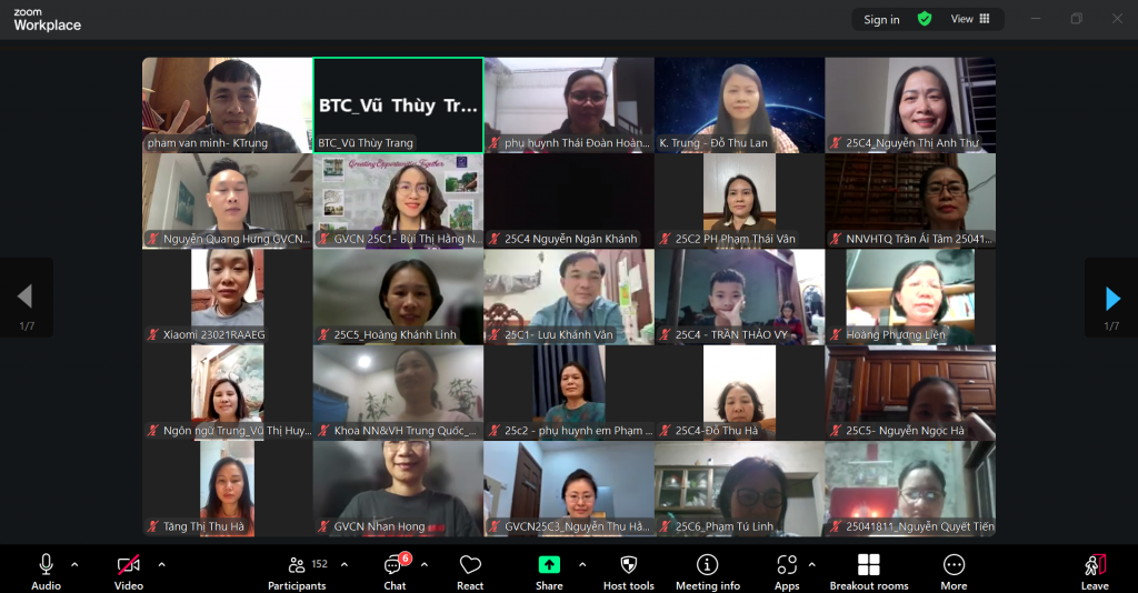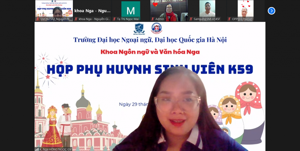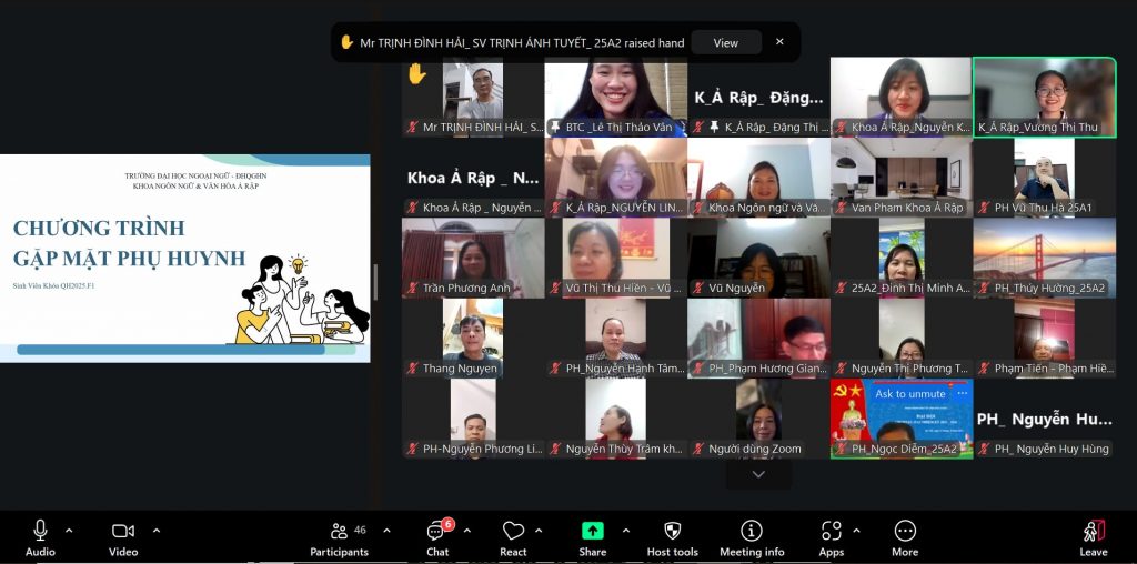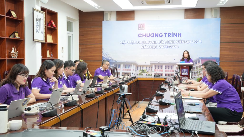 Tối ngày 29/10/2025, Trường Đại học Ngoại ngữ – Đại học Quốc gia Hà Nội đã tổ chức chương trình “Gặp mặt phụ huynh sinh viên khóa QH.2025.F1” năm học 2025 – 2026 theo hình thức trực tuyến qua nền tảng Zoom. Chương trình là dịp để Nhà trường thông tin tới quý phụ huynh về định hướng đào tạo, các hoạt động học tập và rèn luyện của sinh viên, đồng thời lắng nghe những chia sẻ, kỳ vọng của phụ huynh đối với quá trình học tập của con em mình.