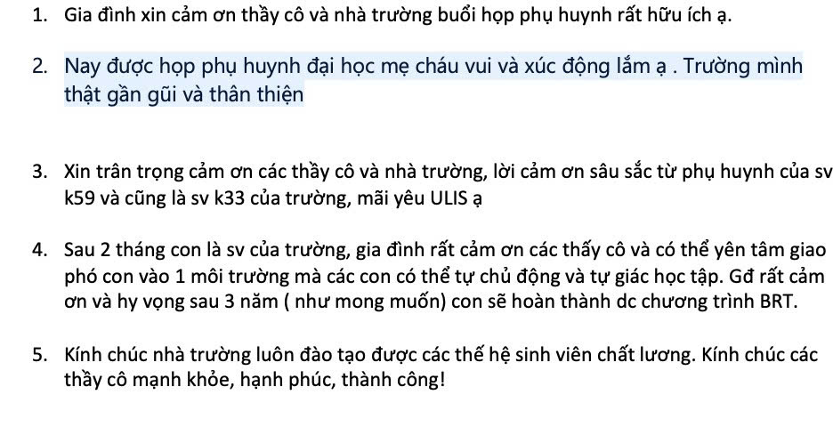 Chia sẻ sau buổi gặp mặt, nhiều phụ huynh bày tỏ niềm vui và sự xúc động khi lần đầu tiên được tham dự một chương trình ý nghĩa, gần gũi như vậy. Một phụ huynh chia sẻ: “Buổi họp hôm nay giúp chúng tôi hiểu rõ hơn về định hướng đào tạo, phương pháp giảng dạy và sự quan tâm của Nhà trường dành cho sinh viên. Cảm nhận được môi trường học tập thân thiện, gần gũi tại trường.” Một phụ huynh khác cho biết: “Sau hai tháng con nhập học, chúng tôi thật sự cảm thấy an tâm khi con em mình được đào tạo trong một môi trường chủ động, năng động, sáng tạo như ULIS”. Nhiều phụ huynh cũng gửi lời cảm ơn sâu sắc tới tập thể thầy cô, chúc Nhà trường tiếp tục đào tạo nên những thế hệ sinh viên chất lượng hơn nữa.