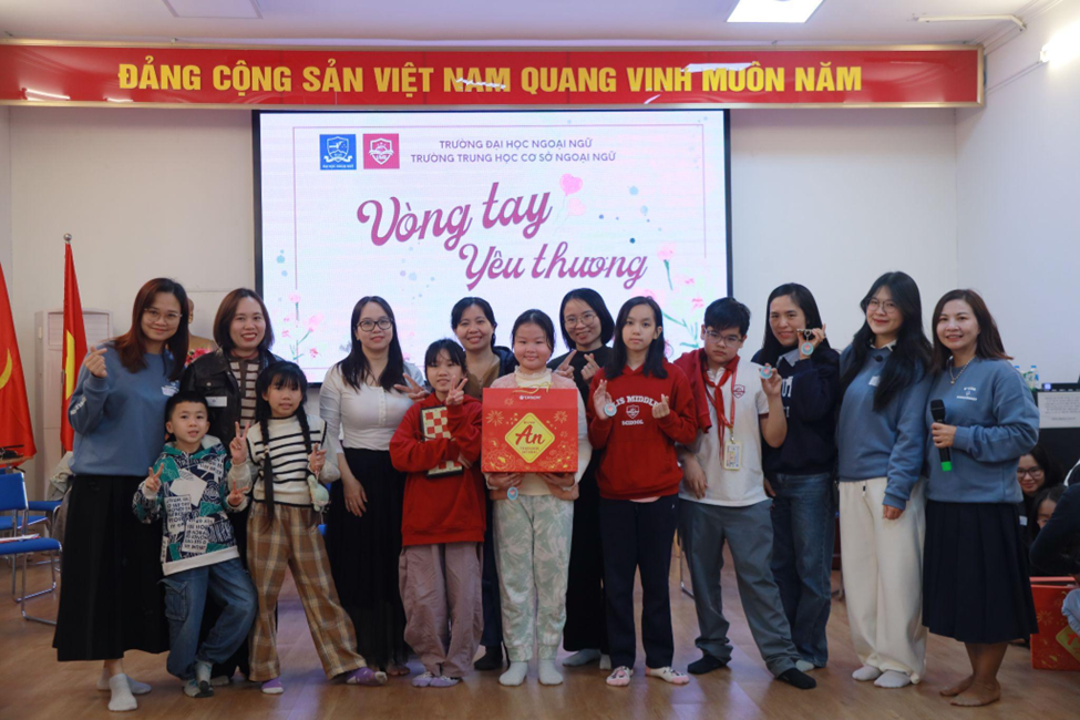 Giảng viên Nguyễn Thị Thu Dung chụp cùng phụ huynh và học sinh trong chương trình “Vòng tay yêu thương 2026” (Trường THCS Ngoại ngữ phối hợp với Khoa TL-GDKP tổ chức)
