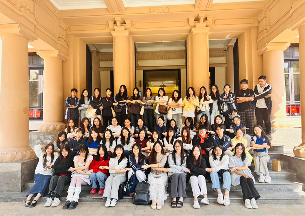 Giảng viên Nguyễn Thị Phương chụp cùng sinh viên học môn Thiết kế cuộc đời đi trải nghiệm tại Bảo tàng mỹ thuật Việt Nam