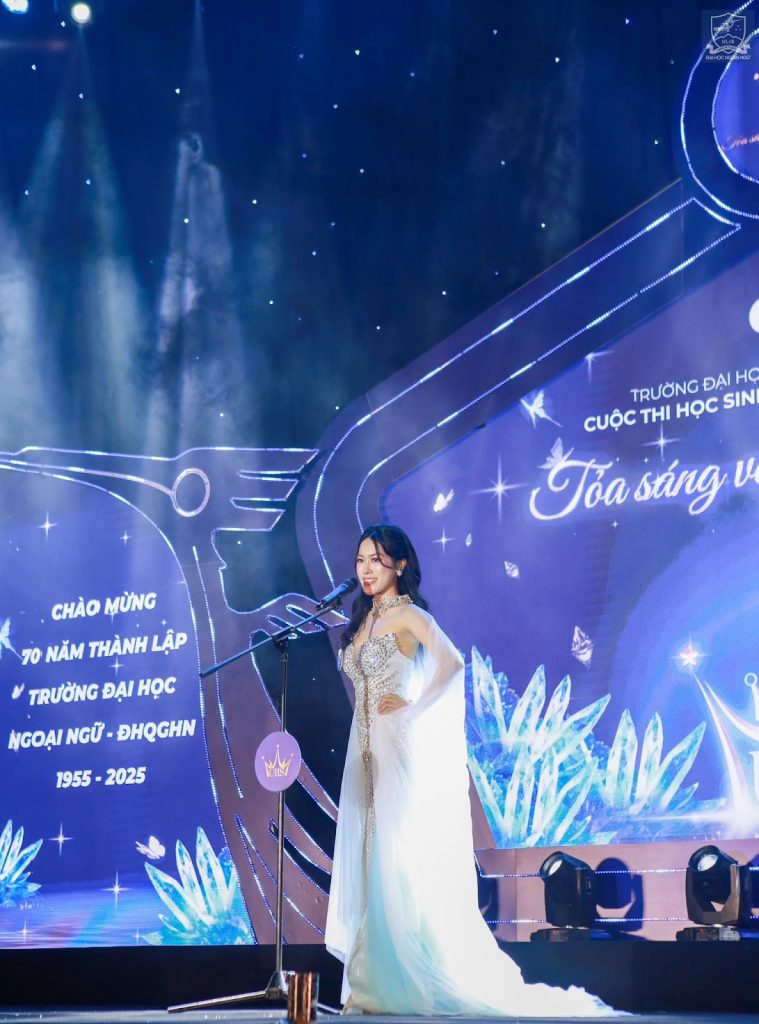 Trần Nguyệt My là sinh viên năm 4 Khoa Ngôn ngữ & Văn hóa Anh, Trường Đại học Ngoại ngữ – ĐHQGHN. Năm 2025, cô thành công đạt được ngôi vị Á khôi 1 trong cuộc thi Sinh viên Thanh lịch năm 2025 – Tỏa sáng vẻ đẹp Ngoại ngữ 2025 của ULIS. Từ một cô bé lớn lên cùng những câu chuyện của bố về giảng đường xưa, My đã biến tình yêu ngôn ngữ thành động lực để vươn mình ra thế giới, đặt chân đến môi trường học thuật hàng đầu châu Á – Đại học Quốc gia Singapore (NUS).