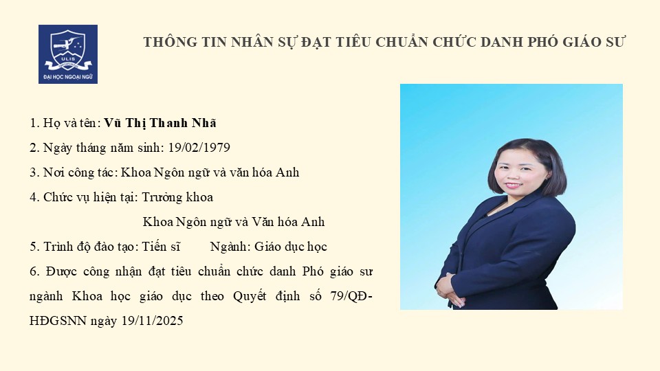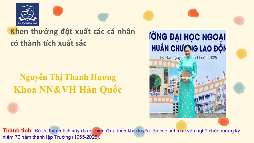 – Cô Nguyễn Thị Thanh Hương (Khoa NN&VH Hàn Quốc) vì đã có thành tích xây dựng, biên đạo, triển khai luyện tập các tiết mục văn nghệ chào mừng kỷ niệm 70 năm thành lập Trường (1955-2025).