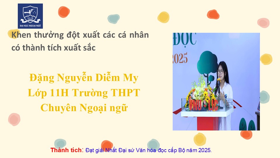 – Học sinh Đặng Nguyễn Diễm My (Lớp 11H Trường THPT Chuyên Ngoại ngữ) vì đạt giải Nhất Đại sứ Văn hóa đọc cấp Bộ năm 2025.