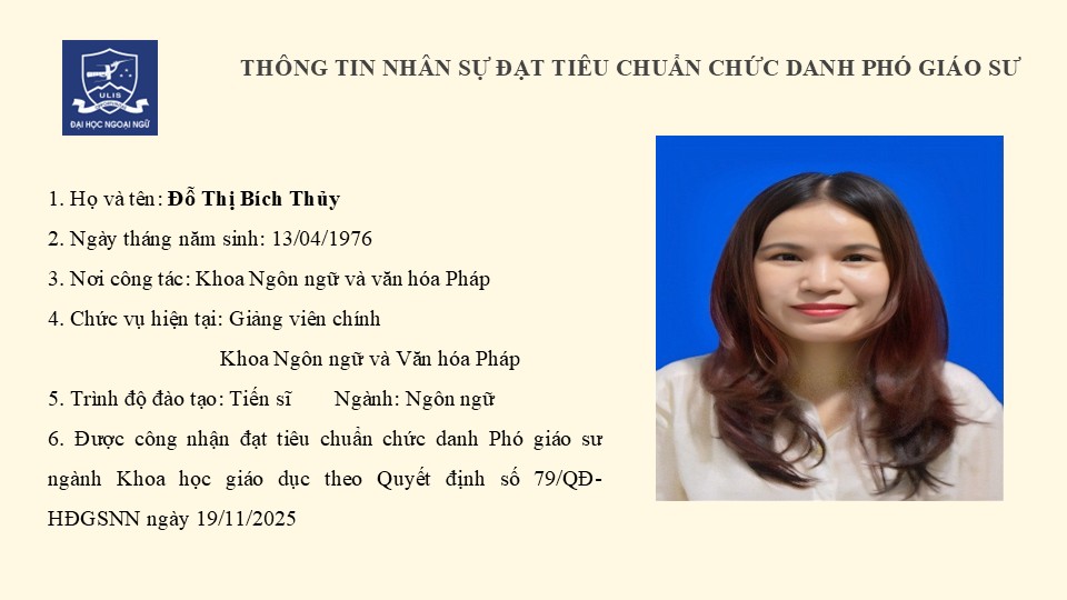 – Cô Nguyễn Thị Thùy Linh (Trường THPT Chuyên Ngoại ngữ) vì đã có thành tích xuất sắc trong công tác tổ chức các hoạt động Công đoàn kỷ niệm 70 năm thành lập Trường ĐHNN, ĐHQGHN (1955-2025).