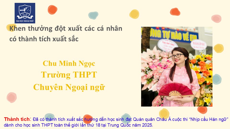 – Học sinh Chu Minh Ngọc (Trường THPT Chuyên Ngoại ngữ) vì đã có thành tích xuất sắc hướng dẫn học sinh đạt Quán quân Châu Á cuộc thi “Nhịp cầu Hán ngữ” dành cho học sinh THPT toàn thế giới lần thứ 18 tại Trung Quốc năm 2025.