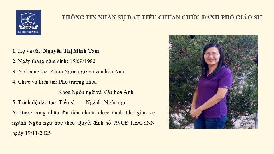 Về quyết định nhân sự, Nhà trường đã trao Quyết định công nhận đạt tiêu chuẩn chức danh Phó giáo sư và khen thưởng cho các cô: Vũ Thị Thanh Nhã (Khoa NN&VH Anh), Đỗ Thị Bích Thủy (Khoa NN&VH Pháp), Nguyễn Thị Minh Tâm (Khoa NN&VH Anh).