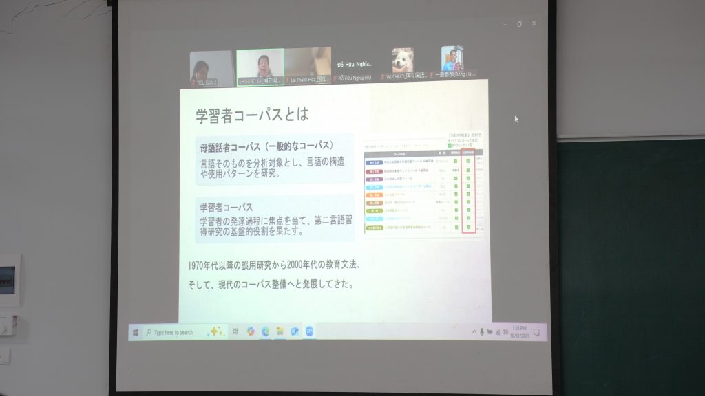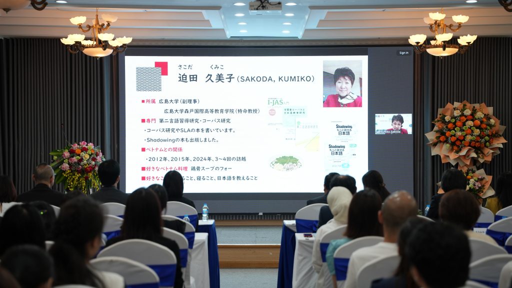 Tại phiên toàn thể, Giáo sư Kumiko Sakoda, một chuyên gia đến từ Đại học Hiroshima, Nhật Bản – đã trình bày báo cáo đề dẫn xoay quanh chủ đề “Từ nghiên cứu thụ đắc ngôn ngữ thứ hai đến giảng dạy tiếng Nhật: Tiếp cận qua phân tích lỗi sai, nghiên cứu Corpus và phương pháp Shadowing”. Bài trình bày đã cung cấp những kiến thức chuyên môn sâu sắc cùng các ví dụ cụ thể về chủ đề được nêu lên. Giáo sư Kumiko Sakoda đã giới thiệu những kết quả nghiên cứu mới nhất và các phương pháp mang tính thực tiễn cao trong giáo dục tiếng Nhật nhằm cung cấp những giải pháp hữu ích có thể áp dụng trong nghiên cứu và giảng dạy Nhật ngữ học sau này. Các đại biểu cũng đã hào hứng đặt câu hỏi giao lưu và trao đổi với Giáo sư Kumiko Sakoda.