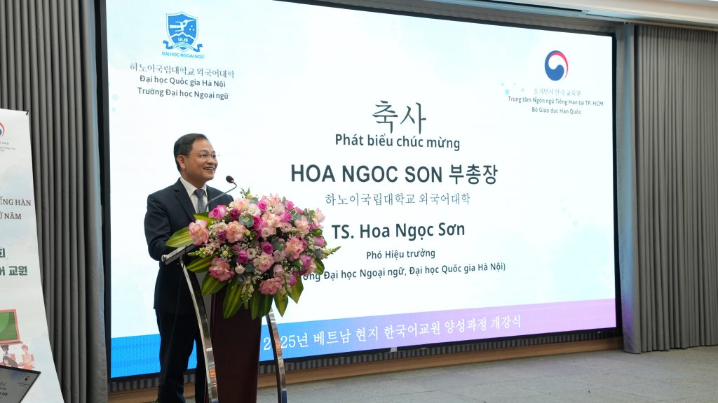 Đáp lại, Phó Hiệu trưởng Hoa Ngọc Sơn trân trọng những đóng góp của Trung tâm Ngôn ngữ tiếng Hàn tại Hồ Chí Minh (Bộ Giáo dục Hàn Quốc) vào thành công của chương trình bồi dưỡng trong suốt 5 năm qua. Điểm lại cột mốc ngày 9 tháng 2 năm 2021 khi tiếng Hàn được Bộ giáo dục và đào tạo Việt Nam lựa chọn trở thành ngoại ngữ 1 theo chương trình 10 năm với nhiều cơ hội và thách thức cho những người trong ngành giáo dục tiếng Hàn ở Việt Nam, TS. Hoa Ngọc Sơn khẳng định khóa học là một trong những dự án trọng điểm nhằm chuẩn bị và kiện toàn đội ngũ giáo viên tiếng Hàn phổ thông sẵn sàng phục vụ cho công tác giảng dạy tiếng Hàn ở cả ba cấp học phổ thông ở Việt Nam. Đánh giá cao quan hệ hợp tác giữa Việt Nam và Hàn Quốc nói chung và sự hợp tác giữa Trường Đại học Ngoại ngữ và Trung tâm Ngôn ngữ tiếng Hàn tại TP. Hồ Chí Minh (Bộ Giáo dục Hàn Quốc) nói riêng, đặc biệt về dự án bồi dưỡng giáo viên và biên soạn sách giáo khoa tiếng Hàn dành cho bậc phổ thông của Việt Nam, Phó Hiệu trưởng cam kết sẽ tích cực đồng hành với các cơ quan chính phủ Hàn Quốc, Bộ Giáo dục và Đào tạo Việt Nam cũng như Bộ Giáo dục Hàn Quốc để đưa chương trình này trở thành một chương trình kiểu mẫu, có thương hiệu và được kì vọng hàng năm dành cho những ai quan tâm đến giáo dục tiếng Hàn phổ thông của Việt Nam.