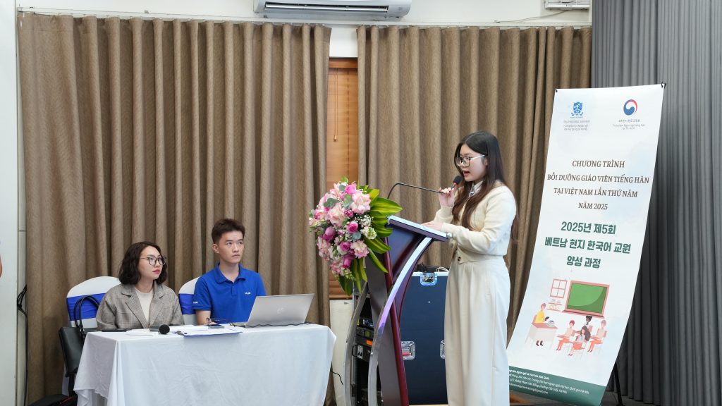 Đại diện cho các học viên tham gia khóa học, học viên Đặng Hải Linh đến từ Trường THPT Chuyên Bắc Ninh bày tỏ vinh dự khi được tham gia vào khóa học lần này. Nhấn mạnh tầm quan trọng của khóa học đối với những giáo viên trẻ, học viên Đăng Hải Linh quyết tâm sẽ cố gắng trau dồi thật tốt các kỹ năng chuyên môn, phát triển kỹ năng sư phạm để trở thành một giáo viên tiếng Hàn thực thụ, từ đó thúc đẩy giao lưu văn hóa giữa Việt Nam và Hàn Quốc.