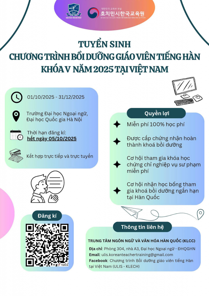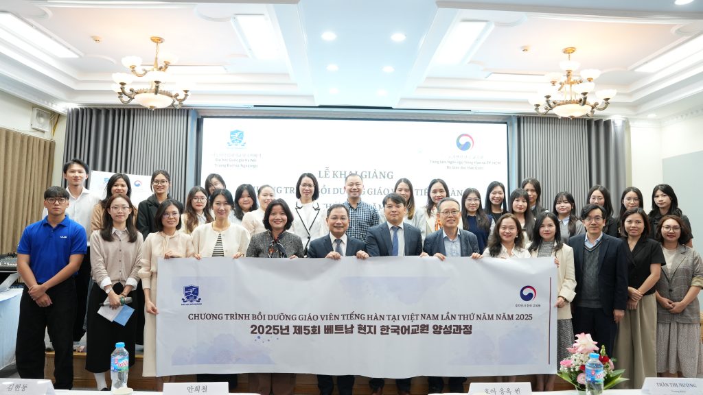 Ngày 23/10/2025, tại Hội trường Sunwah, Trường Đại học Ngoại ngữ – Đại học Quốc gia Hà Nội phối hợp với Trung tâm Ngôn ngữ Tiếng Hàn tại TP. Hồ Chí Minh (thuộc Bộ Giáo dục Hàn Quốc) đã tổ chức lễ khai giảng Chương trình Bồi dưỡng giáo viên tiếng Hàn tại Việt Nam lần thứ 5 năm 2025.