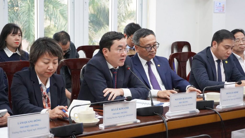 Phát biểu đáp từ, TS. Nguyễn Xuân Long – Hiệu trưởng Trường Đại học Ngoại ngữ khẳng định Nhà trường luôn sẵn sàng đồng hành cùng Cục Đào tạo, Bộ Công an; đồng thời cam kết phát huy tối đa thế mạnh chuyên môn trong các lĩnh vực đào tạo, khảo thí và nghiên cứu ngoại ngữ. Hiệu trưởng nhấn mạnh rằng sự hợp tác giữa hai đơn vị không chỉ mang ý nghĩa chiến lược lâu dài, mà còn thể hiện rõ trách nhiệm xã hội của Nhà trường trong việc góp phần nâng cao chất lượng nguồn nhân lực cho lực lượng Công an nhân dân, phục vụ sự nghiệp xây dựng và bảo vệ Tổ quốc trong bối cảnh hội nhập quốc tế ngày càng sâu rộng.