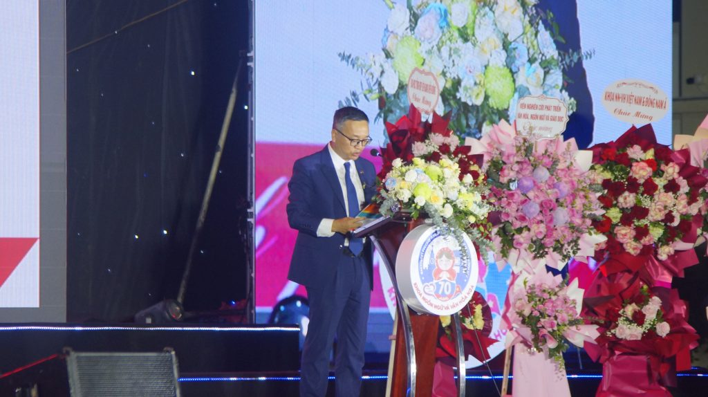 Tại buổi lễ, Chủ tịch Hội đồng trường Đỗ Tuấn Minh đã thể hiện sự trân trọng với những đóng góp to lớn của các thế hệ thầy cô, cán bộ và sinh viên Khoa NN&VH Nga trong suốt bảy thập kỷ. Khoa đã giữ vững truyền thống đoàn kết, chuyên môn vững vàng, đào tạo nên nhiều thế hệ chuyên gia, nhà giáo, nhà ngoại giao và nhà nghiên cứu xuất sắc, đóng góp quan trọng cho quan hệ Việt – Nga. Khẳng định Khoa Ngôn ngữ và Văn hóa Nga không chỉ là địa chỉ đào tạo uy tín mà còn là trung tâm nghiên cứu hàng đầu về ngôn ngữ và văn hoá Nga, với mạng lưới hợp tác quốc tế rộng mở và sức hút tuyển sinh ngày càng tăng, đặc biệt trong bối cảnh mới của quan hệ đối tác chiến lược Việt Nam – Liên bang Nga, tiếng Nga tiếp tục giữ vai trò đặc biệt quan trọng, TS. Đỗ Tuấn Minh tin tưởng rằng với truyền thống 70 năm và đội ngũ giảng viên đầy tâm huyết, Khoa sẽ tiếp tục tiên phong trong đổi mới, chuyển đổi số và ứng dụng AI, xây dựng các chương trình đào tạo hiện đại, đáp ứng nhu cầu xã hội. Thay mặt lãnh đạo Nhà trường, Chủ tịch Hội đồng trường xin gửi lời tri ân sâu sắc và lời chúc mừng nồng nhiệt tới toàn thể các thế hệ thầy cô, sinh viên và học viên của Khoa và chúc Khoa tiếp tục phát triển mạnh mẽ và tỏa sáng hơn nữa trong chặng đường sắp tới.