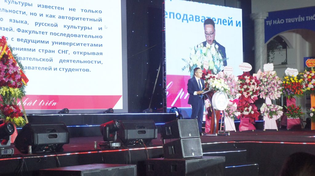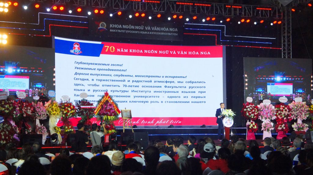 Trong bài phát biểu tại Lễ kỷ niệm 70 năm thành lập Khoa NN&VH Nga, Đại sứ đặc mệnh toàn quyền Liên bang Nga Bezdetko Gennady Stepanovich đã nhấn mạnh về mối quan hệ hợp tác giáo dục – văn hóa mạnh mẽ giữa Việt Nam và Nga và định hướng tăng cường quan hệ hợp tác chiến lược toàn diện Việt – Nga. Những nhiệm vụ mà hai nước đặt ra trong thời gian tới dẫn đến nhu cầu ngày càng lớn về đội ngũ chuyên gia có trình độ tiếng Nga, đặc biệt trong các lĩnh vực dầu khí, khoa học – công nghệ và năng lượng. Hiện nay, hai bên đang mở rộng hợp tác khai thác dầu khí, đồng thời chuẩn bị tiến tới ký kết các thỏa thuận quan trọng cùng việc xây dựng các trung tâm khoa học – công nghệ. Bên cạnh đó, nhiều hoạt động nghiên cứu khoa học hiện đại của Nga cũng được nhắc đến như việc sản xuất dược phẩm tiên tiến. Triển vọng hợp tác trong đóng tàu, hàng không và một số ngành công nghệ cao mở ra nhiều cơ hội cho sinh viên và các chuyên gia tiếng Nga của Việt Nam. Đại sứ gửi lời cảm ơn sâu sắc tới Trường Đại học Ngoại ngữ nói chung các thầy cô của Khoa NN&VH Nga nói riêng vì những đóng góp trong gìn giữ và phát triển hợp tác Việt – Nga, đồng thời gửi lời chúc mừng nhân dịp lễ kỷ niệm 70 năm thành lập Khoa NN&VH Nga.
