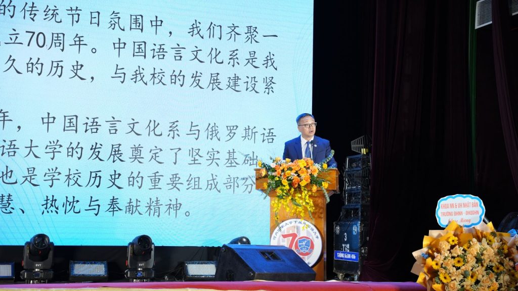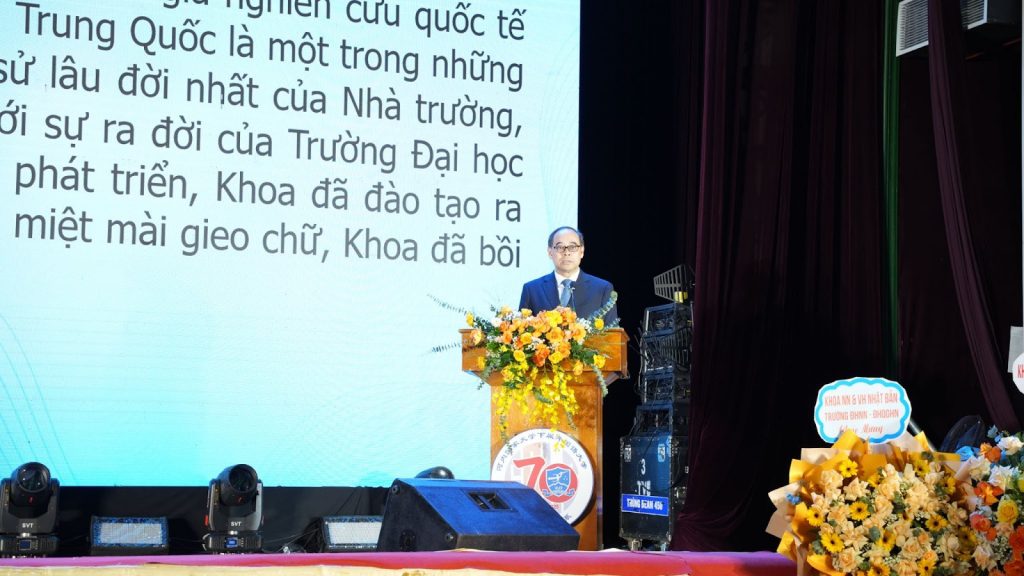 Tại buổi lễ, Chủ tịch Hội đồng trường Đỗ Tuấn Minh đã ghi nhận và biểu dương những thành tích nổi bật mà Khoa Ngôn ngữ và Văn hóa Trung Quốc đã đạt được trong thời gian qua, đồng thời gửi lời tri ân sâu sắc tới các thế hệ giảng viên và sinh viên của Khoa vì những đóng góp bền bỉ cho sự phát triển chung của Nhà trường. “Cách đây 70 năm, năm 1955, cùng với Khoa NN&VH Nga, Khoa NN&VH Trung Quốc đã được thành lập, đặt nền móng cho sự hình thành và phát triển của Trường Đại học Ngoại ngữ ngày hôm nay. Có thể nói, lịch sử của Khoa cũng chính là một phần lịch sử của Nhà trường, nơi hội tụ trí tuệ, tâm huyết, khát vọng cống hiến của bao thầy cô, sinh viên. Trong suốt chặng đường 70 năm đó, các thế hệ thấy cô đã vượt qua bao khó khăn để từng bước xây dựng một tập thể giàu truyền thống, đoàn kết, nhân ái, đầy tinh thần cống hiến. Ngày nay, khoa có đội ngũ giảng viên năng động, tâm huyết, giỏi chuyên môn với tỷ lệ Tiến sĩ chiếm tỷ lệ 77,36% cao nhất toàn trường. Đây là nền tảng vững chắc để khoa đảm nhiệm các nhiệm vụ quan trọng, được đánh giá là một trong những địa chỉ đào tạo uy tín hàng đầu về ngôn ngữ và văn hóa Trung Quốc trong nước và trong khu vực”, TS. Đỗ Tuấn Minh khẳng định.