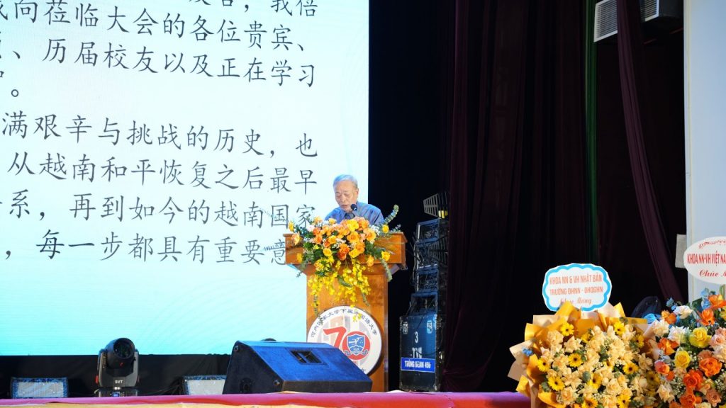 Tiếp nối buổi lễ, đại diện Cựu giáo chức Nguyễn Hữu Cầu đã nhấn mạnh 70 năm là một hành trình đầy những khó khăn và thử thách của Khoa NN&VH Trung Quốc, nhưng cũng ghi dấu vô số kỷ niệm đẹp và khó quên. Từ những ngày đầu là cơ sở đào tạo tiếng Trung đầu tiên sau khi Việt Nam thống nhất đất nước, trải qua giai đoạn sáp nhập vào Khoa Ngoại ngữ, Trường Đại học Sư phạm, đến nay trở thành Khoa Ngôn ngữ và Văn hóa Trung Quốc thuộc Trường Đại học Ngoại ngữ – Đại học Quốc gia Hà Nội, mỗi bước đi đều mang ý nghĩa lớn và đáng ghi nhớ.