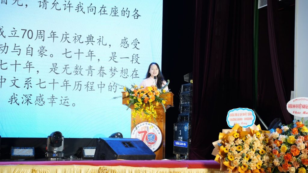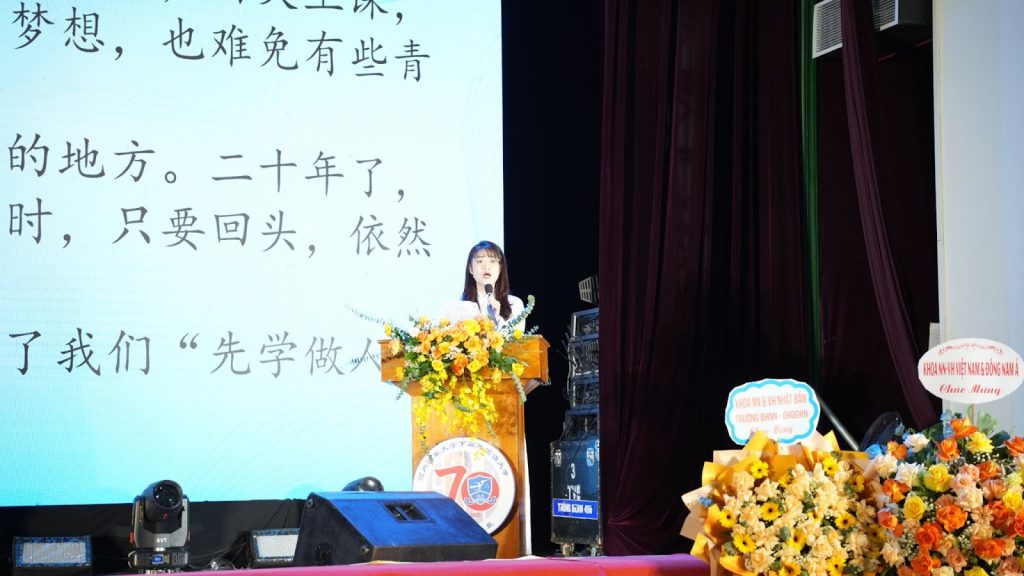 Tiếp theo, trong bài phát biểu, đại diện sinh viên Lê Vũ Thanh Thảo chia sẻ rằng khi tham dự lễ kỷ niệm 70 năm thành lập Khoa Ngôn ngữ và Văn hóa Trung Quốc, em cảm nhận rõ không khí vừa trang trọng vừa ấm áp, khiến bản thân vô cùng phấn khởi và tự hào. Đại diện sinh viên Lê Vũ Thanh Thảo nhấn mạnh rằng 70 năm là chặng đường ghi dấu nỗ lực và trí tuệ của nhiều thế hệ thầy trò, đồng thời là khoảng thời gian vô vàn ước mơ được vun trồng, bén rễ và đơm hoa kết trái trên mảnh đất màu mỡ này. Được là một phần trong lịch sử 70 năm của khoa, được học tập và trưởng thành trong ngôi nhà chung đầy yêu thương và gắn bó, là một vinh dự to lớn đối với Thảo.