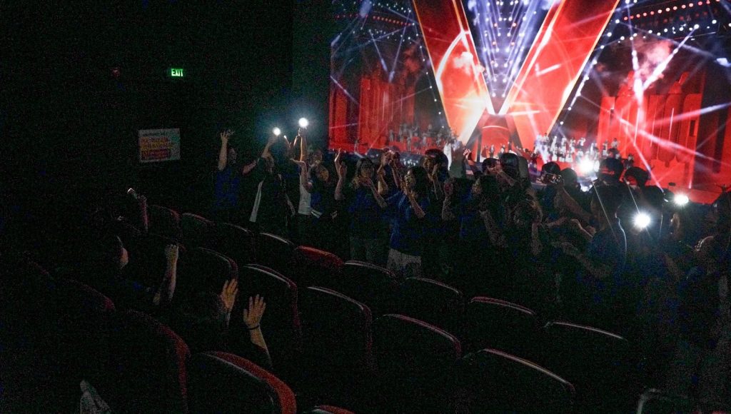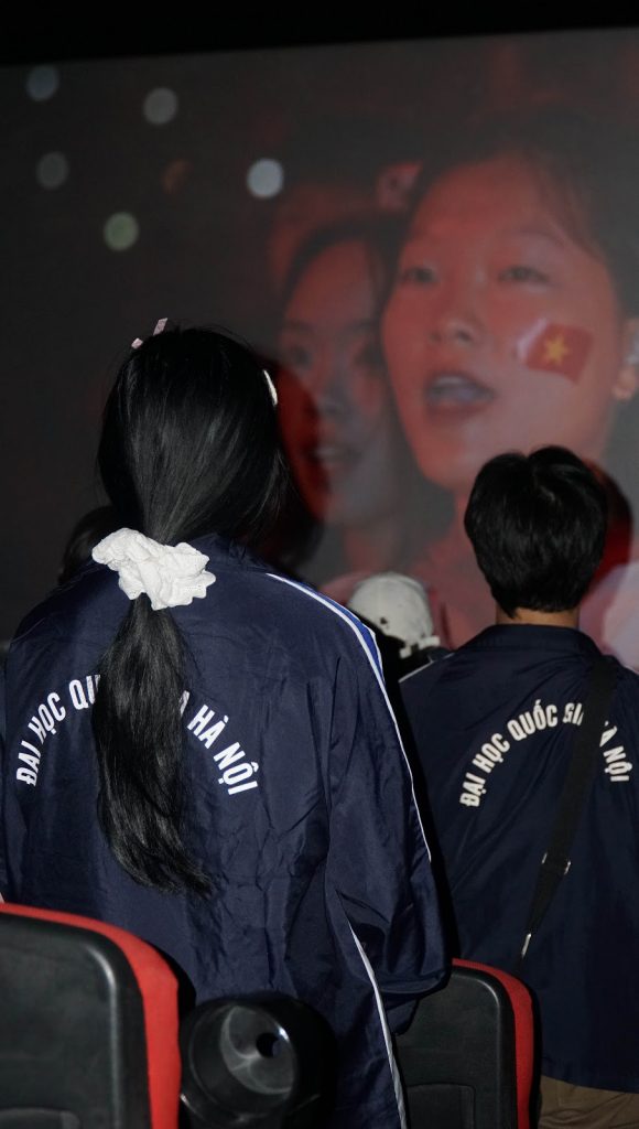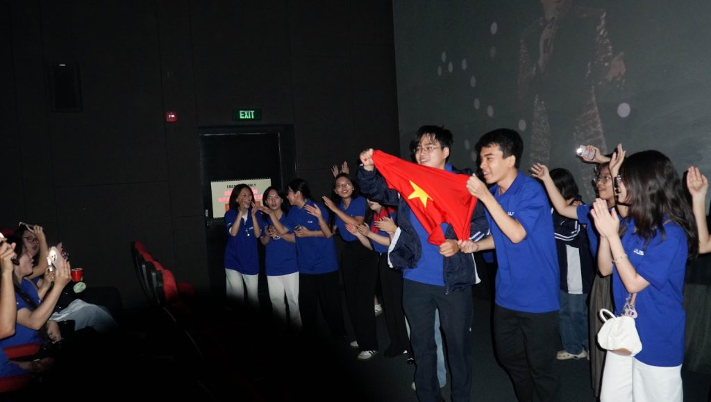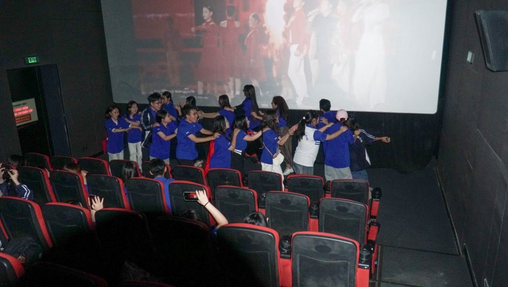 Trong không khí sôi động của buổi chiếu, những giai điệu nhạc phim vang lên khiến cả rạp như hòa làm một. Các bạn sinh viên cùng nhau ngân nga theo từng ca khúc quen thuộc, vỗ tay hòa nhịp với âm nhạc, có nhiều sinh viên còn cùng nhau nhảy theo điệu nhạc, phất cao lá cờ Tổ Quốc tạo nên một bầu không khí vừa sôi nổi, vừa thiêng liêng. Khoảnh khắc cả khán phòng cùng cất giọng hát về niềm tự hào dân tộc và tình yêu đất nước đã gắn kết mọi người lại gần nhau hơn, cùng lan tỏa tinh thần đoàn kết, niềm tin và khát vọng cống hiến cho Tổ quốc.