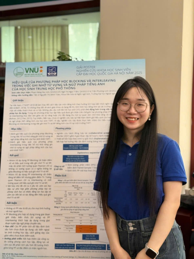 - Chủ nhiệm Đề tài “Hiệu quả của phương pháp học Blocking và Interleaving trong việc ghi nhớ và ngữ pháp tiếng Anh của học sinh Trung học phổ thông” đạt giải Nhất trong Đợt Nghiệm thu thứ 2 năm 2025 Cấp Trường Đại học Ngoại ngữ