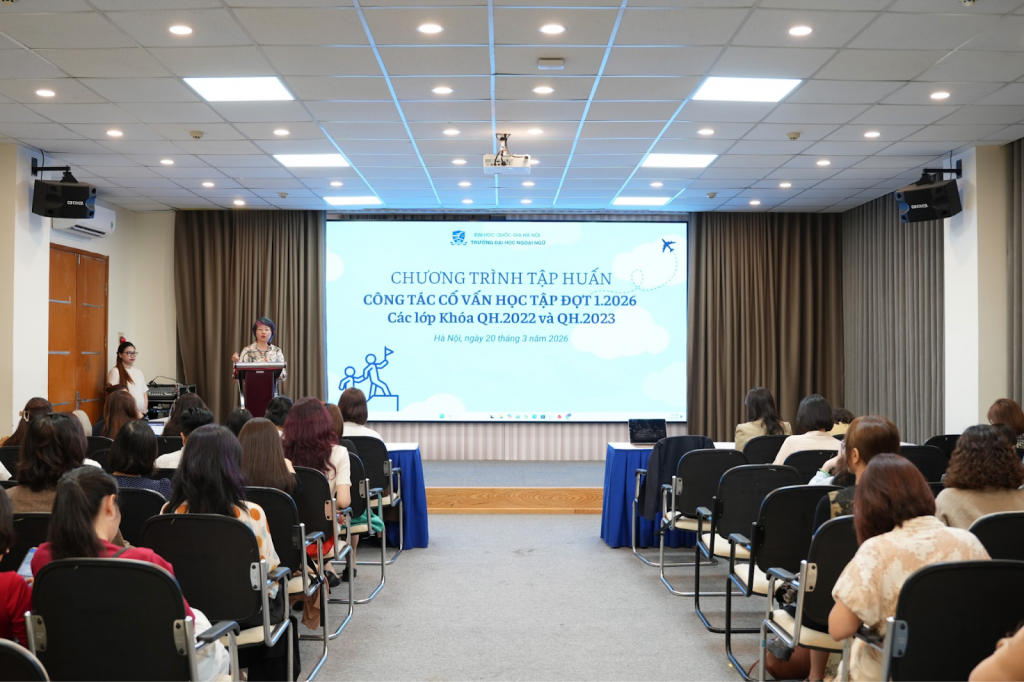 Thực hiện kế hoạch nhiệm vụ năm học 2025-2026, ngày 20/3/2026, tại Hội trường Sunwah, Trường Đại học Ngoại ngữ, Đại học Quốc gia Hà Nội đã tổ chức buổi tập huấn công tác cố vấn học tập đợt 1 năm 2026 các lớp Khóa QH.2022 và QH.2023 nhằm tăng cường hiệu quả triển khai công tác cố vấn học tập trong toàn trường.