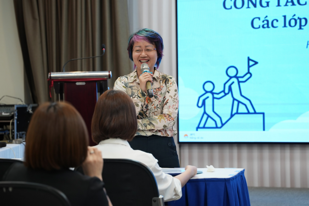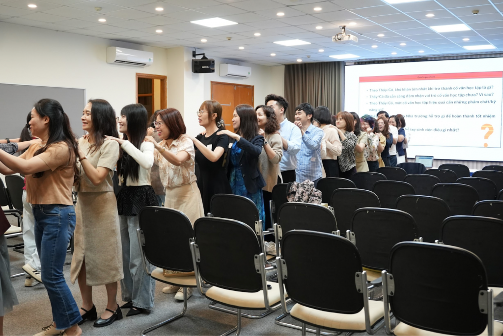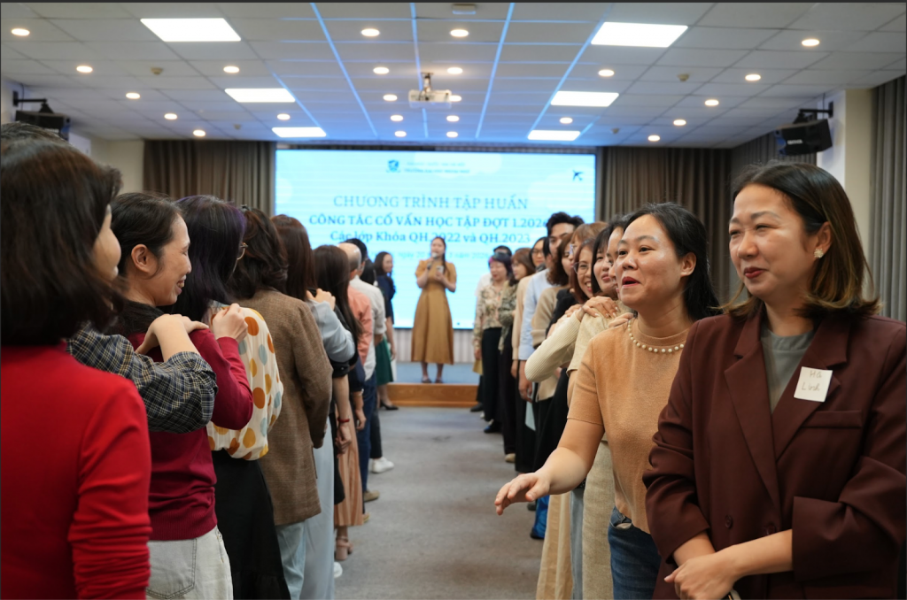 Mở đầu buổi tập huấn, Ban Tổ chức đã triển khai phần khởi động (warm-up) nhằm tạo không khí cởi mở, thân thiện và tăng cường sự kết nối giữa các thầy cô cố vấn học tập tham dự chương trình. Thông qua các hoạt động làm quen ngắn gọn, các thầy cô có cơ hội giao lưu, chia sẻ và bước đầu thiết lập sự tương tác với nhau trước khi bước vào các nội dung chuyên môn. Phần khởi động không chỉ góp phần tạo nên bầu không khí tích cực cho buổi tập huấn mà còn giúp đội ngũ cố vấn học tập thêm gắn kết, từ đó thuận lợi hơn trong quá trình trao đổi kinh nghiệm và phối hợp triển khai nhiệm vụ trong năm học 2025-2026.