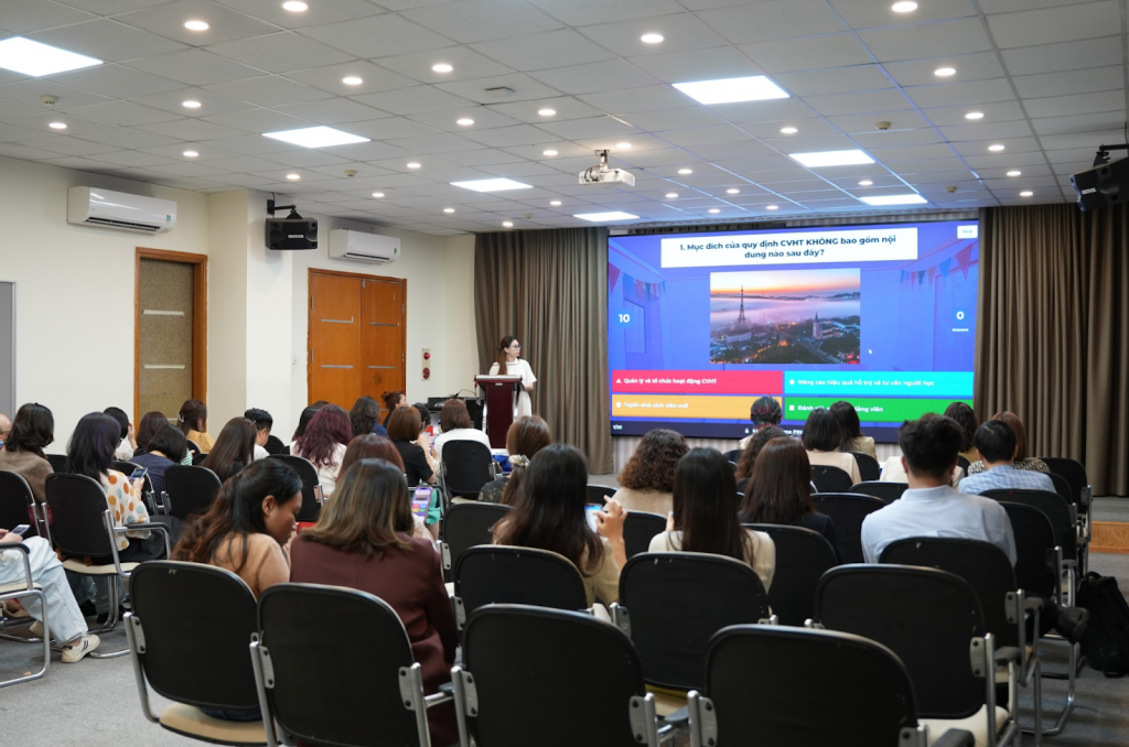 Sau phần phát biểu chỉ đạo, chương trình tiếp tục diễn ra sôi nổi với minigame trả lời câu hỏi trên nền tảng Kahoot. Hoạt động đã thu hút sự tham gia hào hứng của các thầy cô cố vấn học tập, góp phần tạo nên bầu không khí vui vẻ, cởi mở và tăng tính tương tác trong buổi tập huấn. Thông qua các câu hỏi ngắn gắn với nội dung chương trình, minigame không chỉ mang đến những phút giây thư giãn mà còn giúp các thầy cô ôn lại, củng cố thêm các thông tin, quy định liên quan đến công tác cố vấn học tập.