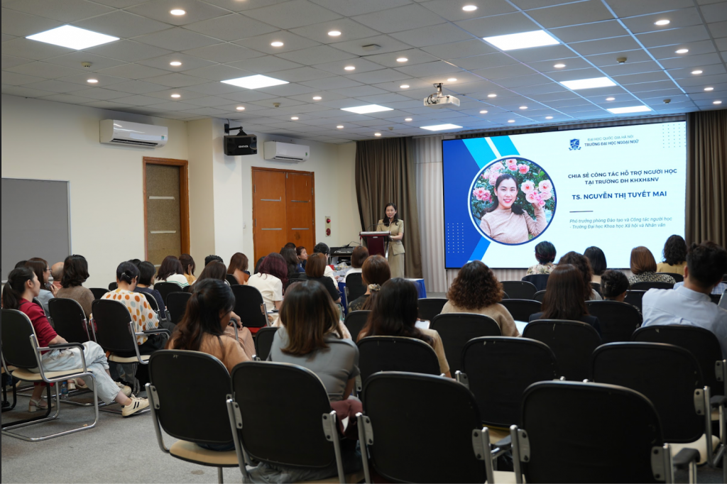Phát biểu tại chương trình, Phó Hiệu trưởng Hà Lê Kim Anh đã nhấn mạnh vai trò quan trọng của công tác hỗ trợ người học trong bối cảnh giáo dục đại học ngày càng đặt ra những yêu cầu cao về chất lượng đào tạo, tư vấn và đồng hành cùng sinh viên. Trong phát biểu của mình, Phó Hiệu trưởng khẳng định đội ngũ cố vấn học tập giữ vị trí đặc biệt quan trọng trong việc kết nối giữa Nhà trường và người học, góp phần hỗ trợ sinh viên trong quá trình học tập, rèn luyện và định hướng phát triển bản thân. Đồng thời, PGS.TS. Hà Lê Kim Anh cũng bày tỏ mong muốn các thầy cô cố vấn học tập sẽ tiếp tục phát huy tinh thần trách nhiệm, sự tận tâm và chủ động để nâng cao hiệu quả công tác này, qua đó góp phần xây dựng môi trường học tập tích cực, nhân văn và lấy người học làm trung tâm tại Trường Đại học Ngoại ngữ, ĐHQGHN.