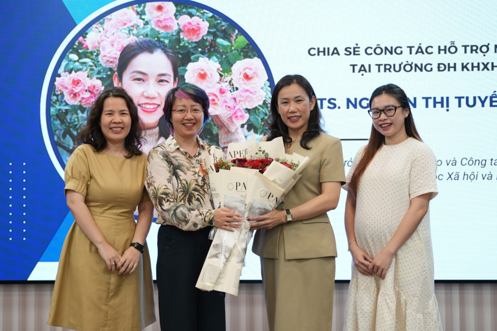 Kết thúc phần trình bày, Phó Hiệu trưởng Hà Lê Kim Anh đã thay mặt Nhà trường gửi tặng hoa và lời cảm ơn tới TS. Nguyễn Thị Tuyết Mai vì những chia sẻ ý nghĩa, thiết thực và giàu giá trị đối với đội ngũ cố vấn học tập tham dự chương trình.