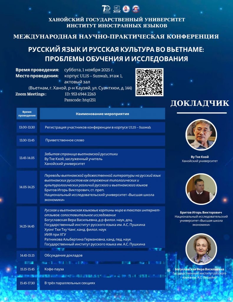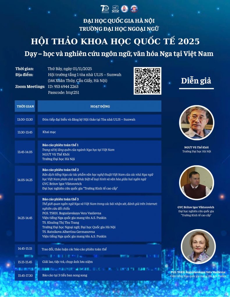Nhân dịp kỷ niệm 70 năm thành lập Khoa Ngôn ngữ và Văn hóa Nga (1955–2025), Trường Đại học Ngoại ngữ – ĐHQGHN trân trọng tổ chức Hội thảo quốc tế với sự tham gia của nhiều chuyên gia, giảng viên và nhà nghiên cứu đến từ Việt Nam và Liên bang Nga.
