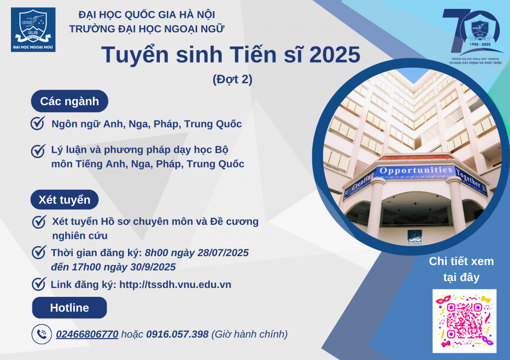 Thông báo tuyển sinh đào tạo tiến sĩ đợt 2 năm 2025 của Trường Đại học Ngoại ngữ, ĐHQGHN – Trường Đại học Ngoại ngữ – Đại học Quốc gia Hà Nội