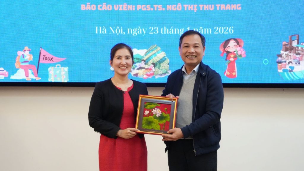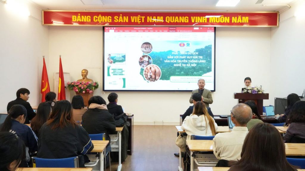 Ngoài ra, PGS. TS. Ngô Thị Thu Trang cũng trình bày báo cáo với chủ đề “Phát triển du lịch gắn với phát triển làng nghề văn hóa Hà Nội”. Báo cáo tập trung phân tích hệ thống các quyết định, nghị định và kế hoạch của Nhà nước liên quan đến phát triển du lịch và làng nghề, đồng thời khái quát đặc điểm kinh tế, văn hóa của Thủ đô Hà Nội. Nội dung báo cáo làm rõ mối quan hệ mật thiết giữa du lịch và việc phát huy giá trị văn hóa làng nghề, chỉ ra thực trạng, những vấn đề đặt ra trong quá trình khai thác, cùng một số hình thức triển khai tiêu biểu và các kết quả bước đầu đạt được. Những chia sẻ này đã mang đến cho sinh viên cái nhìn toàn diện, thực tế về vai trò của du lịch trong bảo tồn và phát triển văn hóa làng nghề trong bối cảnh hiện nay.
