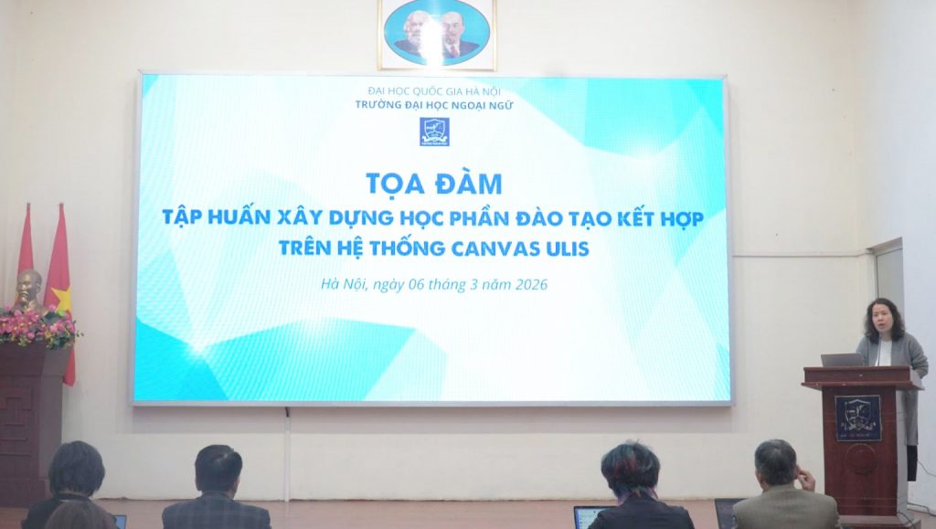 Sáng ngày 6/3/2026, tại Hội trường Vũ Đình Liên, Trường Đại học Ngoại ngữ – Đại học Quốc gia Hà Nội đã tổ chức Tọa đàm tập huấn xây dựng học phần đào tạo kết hợp trên hệ thống Canvas ULIS. Chương trình được tổ chức nhằm hỗ trợ đội ngũ cán bộ, giảng viên tiếp cận và sử dụng hiệu quả hệ thống quản lý học tập Canvas ULIS trong quá trình thiết kế và triển khai các học phần giảng dạy theo hình thức kết hợp.