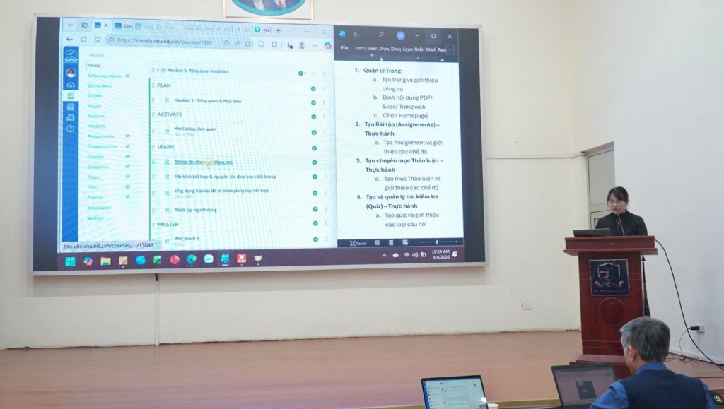 Tọa đàm tập huấn đã diễn ra trong không khí tích cực và sôi nổi với sự tham gia tích cực của các thầy cô. Thông qua chương trình, các cán bộ giảng viên không chỉ được tiếp cận rõ hơn với cách thức vận hành của hệ thống Canvas ULIS mà còn có cơ hội trao đổi kinh nghiệm trong việc ứng dụng công nghệ vào giảng dạy. Có thể nói, đây là một hoạt động thiết thực và bổ ích, góp phần hỗ trợ đội ngũ giảng viên của nhà trường nâng cao hiệu quả tổ chức học phần và phát triển các phương thức giảng dạy phù hợp với xu hướng giáo dục hiện đại.