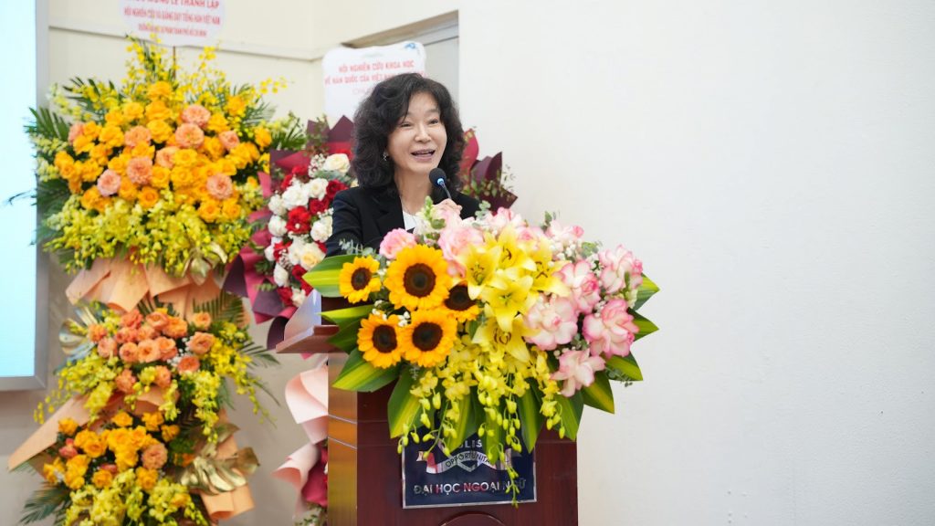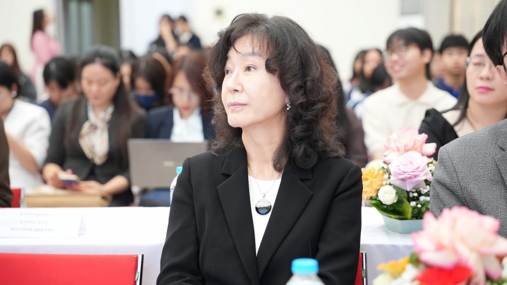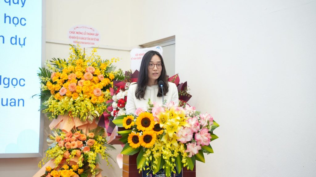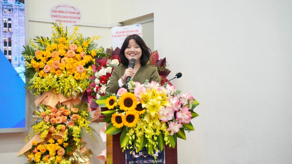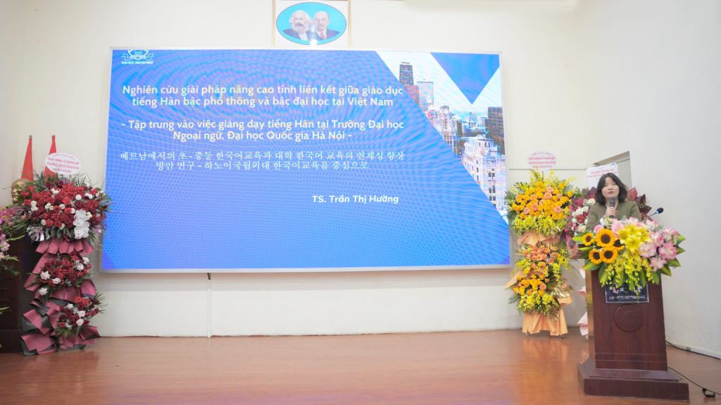 Cuối phần tham luận, Trưởng khoa Ngôn ngữ và Văn hóa Hàn Quốc Trần Thị Hường đã trình bày báo cáo “Nghiên cứu giải pháp nâng cao tính liên kết giữa giáo dục tiếng Hàn bậc phổ thông và bậc đại học tại Việt Nam – Tập trung vào việc giảng dạy tiếng Hàn tại Trường Đại học Ngoại ngữ, ĐHQGHN”. Bài tham luận nhấn mạnh vào sự phổ biến của tiếng Hàn đối với học sinh, sinh viên Việt Nam kể từ lúc đưa tiếng Hàn vào giảng dạy chính quy trên cả nước, khẳng định vị thế và thế mạnh của tiếng Hàn trong thị trường Việt Nam trong tương lai. Đồng thời, Trưởng khoa Ngôn ngữ và Văn hóa Hàn Quốc cũng đặt ra các mục tiêu tập trung nâng cao chất lượng giảng dạy tiếng Hàn tại Trường Đại học Ngoại ngữ – ĐHQGHN trong thời gian tới.