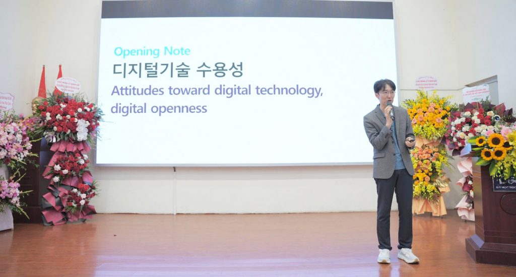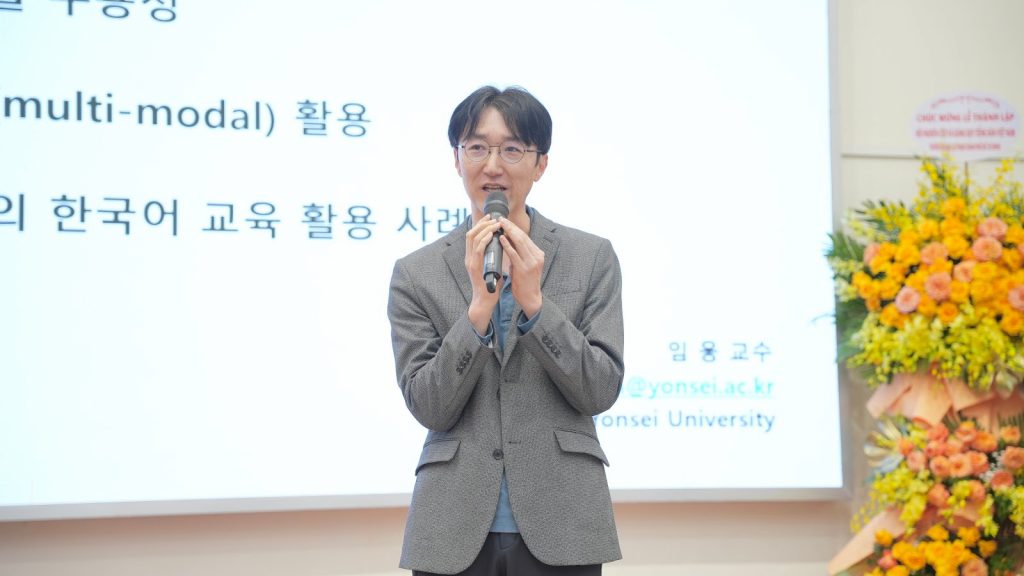 Nối tiếp chương trình, GS. Lim Woong đến từ Đại học Yonsei cũng đã mang tới những thông tin hữu ích qua phần thuyết giảng “Phương pháp giảng dạy tiếng Hàn và ứng dụng AI”. Bài thuyết giảng đã cung cấp cho người tham dự những góc nhìn mới về việc học tiếng Hàn cùng với sự hỗ trợ của các phần mềm AI như: tạo âm thanh giọng đọc qua văn bản, tạo video âm thanh, hình ảnh, ca khúc từ các từ vựng tiếng Hàn, cũng như luyện tập và học tiếng Hàn qua các bài luyện tập được lập trình sẵn trên các ứng dụng AI. Những thông tin mới mẻ và sinh động đã thu hút sự chú ý và hưởng ứng từ bạn sinh viên, giúp quá trình học tập tiếng Hàn trở nên dễ dàng, hiệu quả hơn.