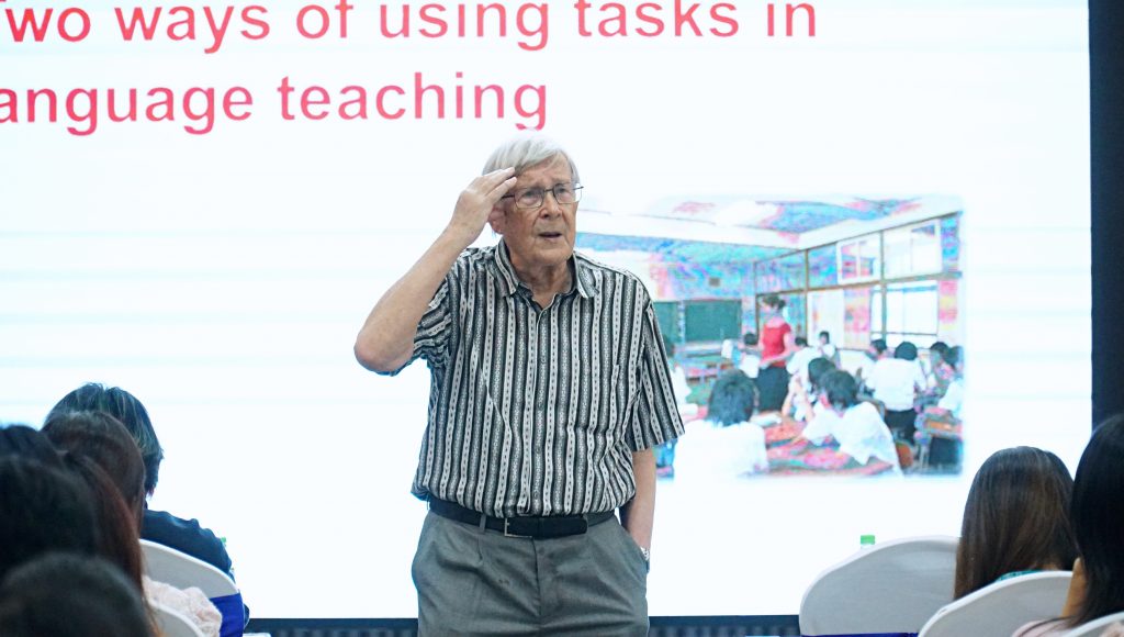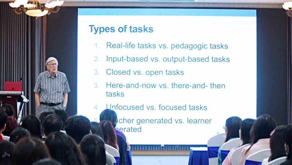 Trong phần đầu của bài nói chuyện, Giáo sư Rod Ellis đã đưa ra định nghĩa rõ ràng về khái niệm “task” (nhiệm vụ) trong giảng dạy ngôn ngữ, đồng thời phân biệt sự khác nhau giữa nhiệm vụ và các bài tập truyền thống. Qua những ví dụ cụ thể, người tham dự có cái nhìn rõ hơn về vai trò của nhiệm vụ trong việc thúc đẩy khả năng sử dụng ngôn ngữ thực tế của người học.