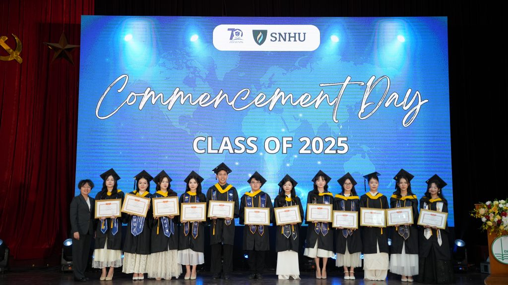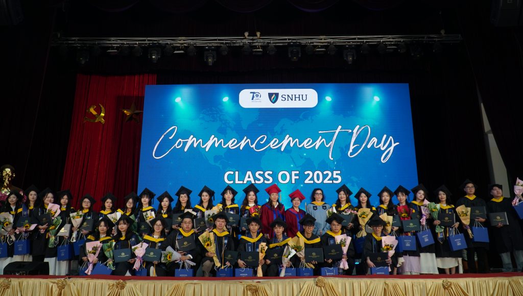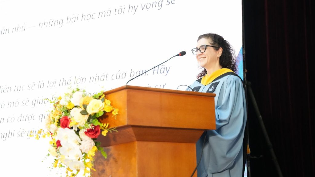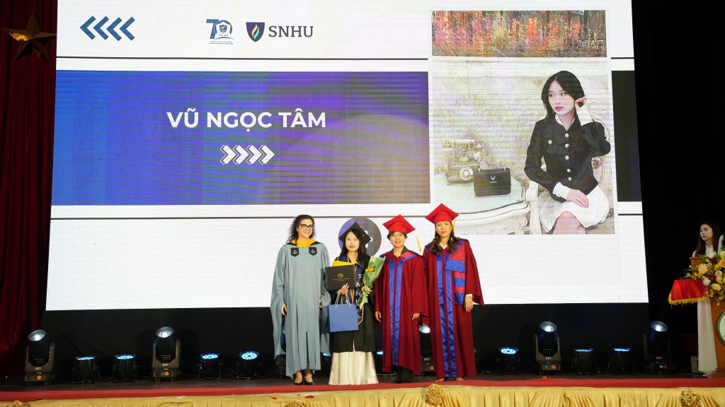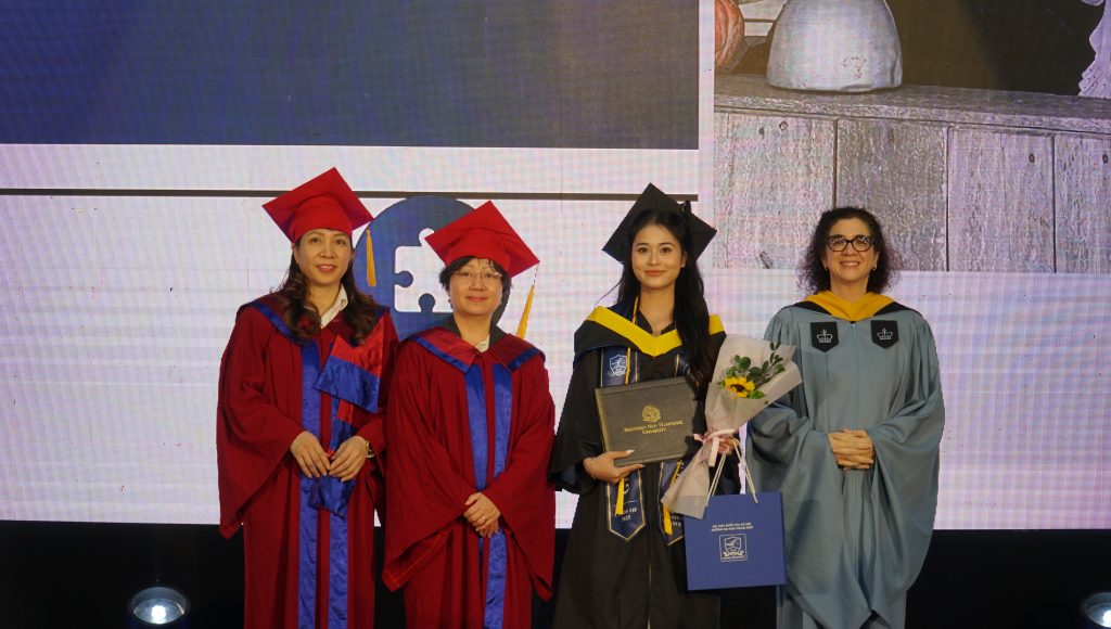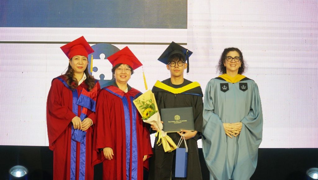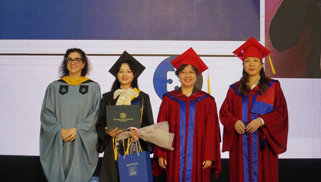 Cũng tại buổi lễ, đại diện Trường Đại học Southern New Hampshire, bà Rachael Sears xúc động gửi lời chúc mừng và lời nhắn nhủ tới các tân cử nhân: “Luôn giữ tinh thần ham học hỏi, lãnh đạo bằng sự chính trực và lòng nhân ái, và dũng cảm tạo dựng con đường của riêng mình”. Bà cũng khẳng định các tân cử nhân là minh chứng cho sức mạnh của giáo dục toàn cầu và thể hiện sự mong chờ được thấy những điều tuyệt vời các bạn đem tới.