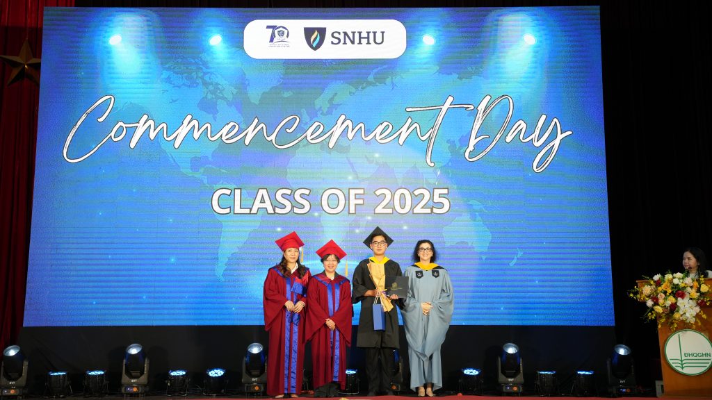 Ngày 06/11/2025, tại Hội trường Nguyễn Văn Đạo, Trường Đại học Ngoại ngữ – Đại học Quốc gia Hà Nội đã long trọng tổ chức Lễ trao bằng cử nhân cho 146 sinh viên chương trình đào tạo chính quy liên kết quốc tế với Đại học Southern New Hampshire (Hoa Kỳ) ngành Kinh tế tài chính khóa QH.2021 và QH.2022.
