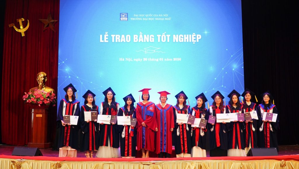 Ngày 30/01/2026, Trường Đại học Ngoại ngữ – Đại học Quốc gia Hà Nội đã tổ chức Lễ bế giảng và trao bằng cử nhân cho 180 sinh viên tốt nghiệp đợt xét tháng 12 năm 2025 tại Hội trường Nguyễn Văn Đạo.