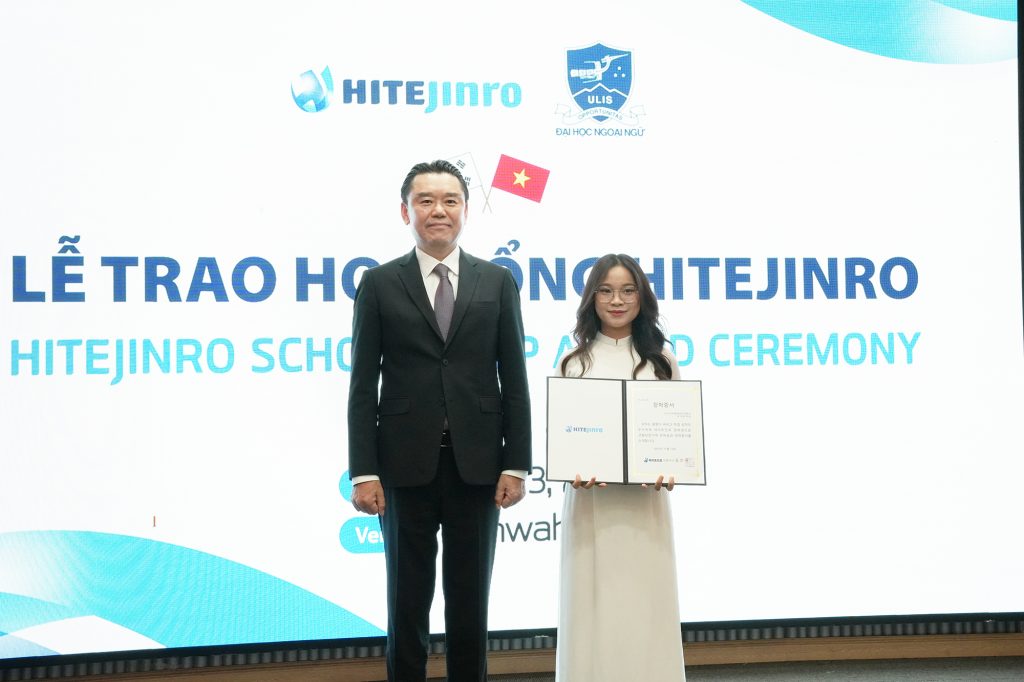 Phát biểu tại buổi lễ, ông Kim In Kyu – Chủ tịch Tập đoàn HITEJINRO đã gửi lời chúc mừng tới những sinh viên được trao học bổng. Chủ tịch Tập đoàn HITEJINRO hy vọng những suất học bổng này sẽ tạo điều kiện học tập tốt, góp phần xây dựng tương lai và ước mơ cho các em sinh viên, những người sau này sẽ trở thành nền tảng to lớn cho sự phát triển của Việt Nam và góp phần phát triển mối quan hệ Việt – Hàn.