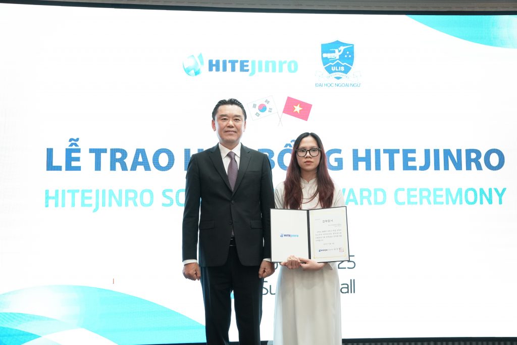 Tại buổi lễ, ông Kim In Kyu – Chủ tịch Tập đoàn HITEJINRO đã đại diện Tập đoàn trao học bổng cho các sinh viên Khoa Ngôn ngữ và Văn hóa Hàn Quốc. Những phần học bổng ý nghĩa này là sự ghi nhận và khích lệ dành cho nỗ lực học tập, rèn luyện của các em trong suốt thời gian qua.