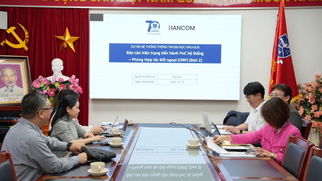 Trong buổi chiều, Trường Đại học Ngoại ngữ đã đón tiếp Tập đoàn Hancom – một trong những doanh nghiệp công nghệ hàng đầu Hàn Quốc để cập nhật tiến độ Dự án hợp tác giữa hai bên. Đại diện Hancom, ông Park Keun Hyung đã báo cáo kết quả thực hiện sau giai đoạn kiểm chứng POC (đợt 1) và tiến độ POC (đợt 2), trong đó 22/26 nhóm chức năng đã được triển khai, bao gồm các tính năng về quản lý MOU, đối tác trong và ngoài nước, cùng nhiều tiện ích bổ sung khác. Mặc dù vẫn còn một số hạn chế, ông khẳng định Hancom sẽ tiếp tục hoàn thiện để đáp ứng đầy đủ yêu cầu của ULIS.