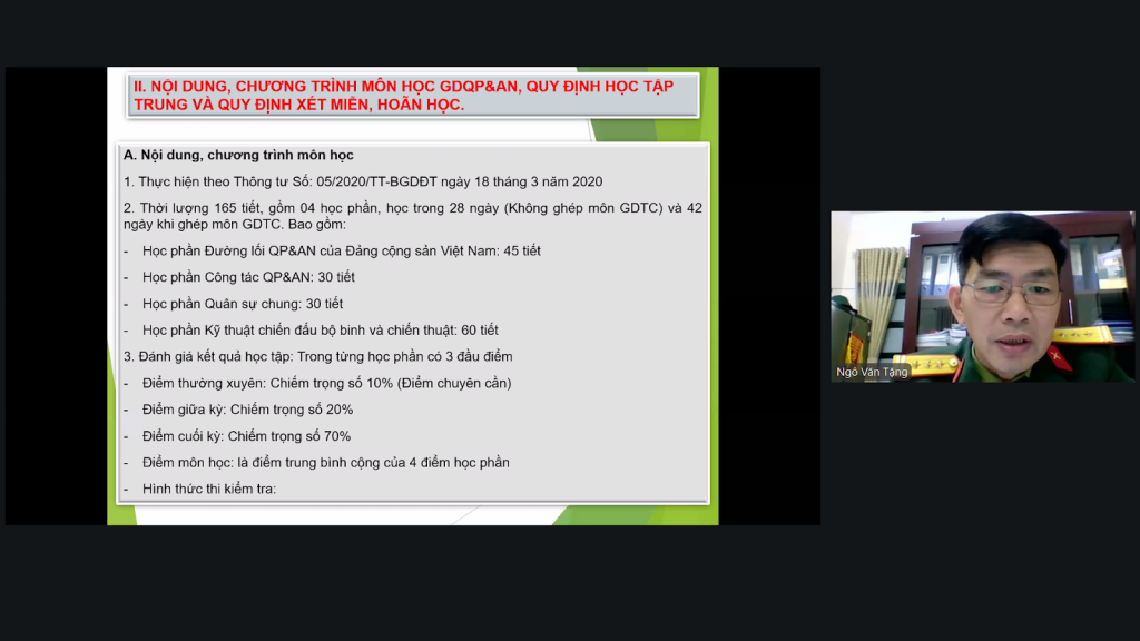 Tiếp theo chương trình, đại diện Trung tâm Giáo dục Quốc phòng và An ninh, Thượng tá, Trưởng phòng Đào tạo và Quản lý người học Ngô Văn Tặng đã phổ biến những thông tin cơ bản về Trung tâm Giáo dục Quốc phòng và An ninh cùng các nội dung cụ thể về chương trình môn học GDQP&AN, các quy định, nội quy học tập và một số vấn đề cần lưu ý về đồ dùng cần chuẩn bị cho thời gian học tập tại Trung tâm.